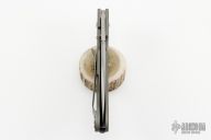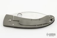This Large Chinese Folder by the Late Bob Lum features a hand rub satin finished blade with thumbhole. The handle has a bead blasted titanium frame and tip up clip, lanyard hole at the butt and a black G-10 backspacer. Nice detent, lockup and blade seating. Has a couple light scuffs, otherwise excellent condition. Comes with a velcro pouch.