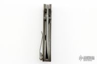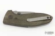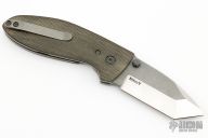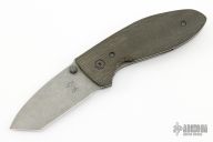 This Alpha framelock by Tom Krein features a stonewash finished chisel ground blade with dual thumbstuds and a false top edge. The handle has green micarta scales, tumbled titanium liners and tip up clip, titanium backspacer. Nice lock up, detent and blade seating. Includes a padded case and COA. Has some light scratches on the blade. Excellent condition otherwise.