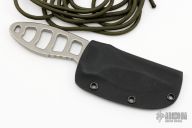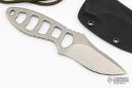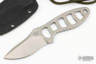 This neck knife by Walter Brend features a hand ground stonewashed blade with a false top edge and notched thumb-rest. 3/16" blade stock and 1" blade depth. The handle is skeletonized. Comes with a kydex sheath. Comes with original box and paper. Excellent condition.