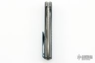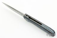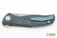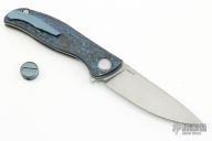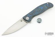 This F3 Flipper from Shirogorov has a tumble finished flat ground spear point Vanax 37 blade with notched flipper. Handle has aquatic blue carbon fiber scales, anodized titanium backspacer, tip up clip and liners. Recessed lanyard bail. Dead center blade seating, excellent detent and lockup. Multi Row Bearing System. Comes with original box and COA, as well as a matching bead.  Excellent condition.