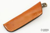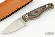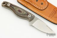 This knife by Gary Creely features a satin finished blade with .106" blade stock and 1.060" blade depth, full tang construction. The handle has python micarta scales. Comes with a brown leather sheath and original box. Excellent condition.