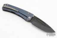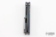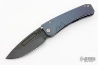This Midi Marauder from Medford Knife and Tool features black PVD finished drop point blade with fullers.  The handle has a tumbled and anodized titanium frame with a tumbled tip up clip over satin barrel spacers.   Excellent detent, lockup, and seating. Original box, case and papers. Excellent condition.