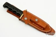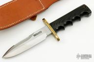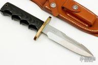 This Model 15 from Randall Made Knives features a satin finished spear point blade with sharpened top edge and sawteeth, .208" blade stock and 1.180" blade depth, full tang construction. The handle is comprised of a brass guard and black linen micarta finger grip style handle. Comes with brown leather sheath. Has "G.H.S." on the blade. Has a few light scratches, otherwise excellent condition.