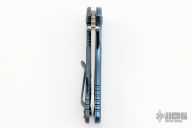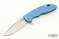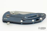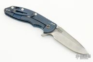 This XM-18 by Rick Hinderer features a tumble finished blade with notched thumbrest and flipper. The handle has an anodized and tumbled titanium front scale, liner, frame, and a tip up or down reversible finished titanium clip and filler tab, lanyard hole at the butt. Has some scuffs, otherwise good condition.