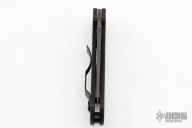 Handle: Peel ply textured, chamfered black G10 scales house inset skeletonized stainless liners, one forming the Compression Lock mechanism. A generous palm swell, index groove and pinky hook offer comfortable ergonomics and a secure grip for most users.