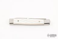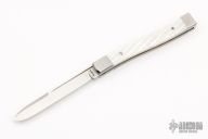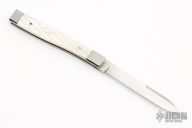 This Doctors knife by Richard Rogers features a hand rub satin finished blade with long pull nail nick. The handle has stainless steel bolsters with integral liners, fluted mother of pearl covers, stainless steel spring. Frame is nicely rounded. Comes with original box and COA dated Jan 2007. Has a small rust spot on one of the rear bolsters, and a couple very light scratches, excellent condition.