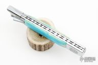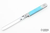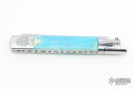 This Picklock Auto by Agasi Hambartsumian of Armenian Doctor Knives features a mirror polished blade. The handle has a polished stainless steel frame with fileworked stainless steel backspacer, dyed bone scales with brass pins.  New from maker.