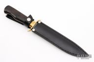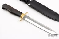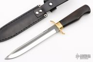 This Gentleman's Bowie by Armenian Doctor Knives features a mirror polished blade made from a file, false top edge but maintains the file ridges, .202" blade stock and .942" blade depth, hidden tang construction. The handle has a brass guard and collar with a dark wood grip. Comes with a black leather sheath. New from maker. Has one small ding on the guard from shipping. Really attractive knife.
