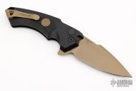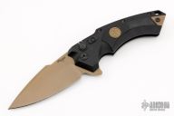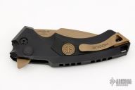 The X5 by Hogue Knives and SigSauer, features a bronze coated spear point blade made from CPM-154 steel. The handle is black anodized aluminum. Includes a bronzed stainless steal, reversible clip, tip up carry. The knife has a forward fire safety. There is a lanyard hole towards the butt of the knife. Includes original box, papers and padded zippered case with an extra clip. Excellent condition.