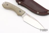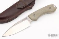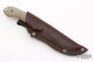 This Guardian 4 by Bradford Knives features a two-tone drop point blade with notched thumbrest, .168" blade stock and 1.447" blade depth, full tang construction with green canvas micarta scales. Comes with a brown leather sheath and original box.  Excellent Condition.