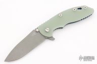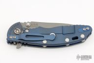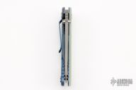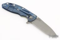This 3.5" Slicer XM-18 flipper from Hinderer Knives has a working finished blade with notched thumbrest and flipper, no choil. Translucent green G-10 scale and a battle blue titanium frame and clip. Reversible pocket clip. Strong lock up, nice detent and blade seating is center. Includes original box, extra bushings and papers. Comes with additional blue anodized hardware kits. Excellent condition.