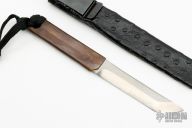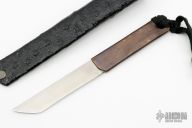 This is kozuka by Phill Hartsfield has a chisel ground tanto blade with .118" blade stock and .740" blade depth, hidden tang construction. The handle has a copper wrap. Includes the original paper lined, leather covered metal sheath with clip. Excellent Condition.