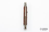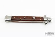 This 11" Picklock Auto by Frank Beltrame features a polished bayonet ground blade with false top edge. The handle has stainless steel bolsters, front and rear, snakewood scales, brass liners, stainless spring. Has a couple light scratches and a crack in the front scale, otherwise good condition.