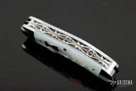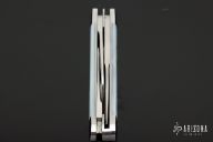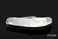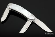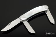 This Sowbelly Stockman by Jim Dunlap features 3 hand rub satin finished blades with nail nicks. The handle has stainless steel bolsters, front and rear, mother of pearl scales with stainless steel escutcheon, fileworked stainless steel liners and springs. Has half-stops, flush in all positions. Comes with a zippered case and COA. New from maker.
