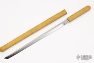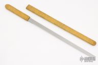 This Extra Long Tanto by Phill Hartsfield features a chisel ground tanto style blade with .249" blade stock and .747" blade depth, hidden tang construction. The handle has epoxied cord. Includes a paper lined metal sheath with epoxied cord exterior. Excellent condition.