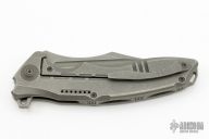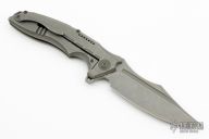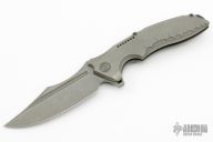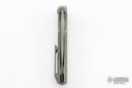 This 814B Chimera by WE Knife Company features a clip point blade with swedge, notched thumbrest, fullers and flipper. The handle is comprised of a machined and tumbled titanium frame over a matching backspacer. Matching tip up clip with anodized titanium hardware. Includes original box and papers. Excellent condition.