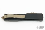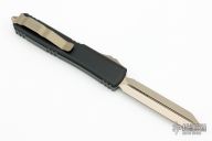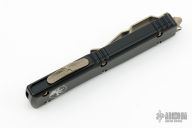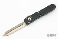This Ultratech by Microtech knives has a bronze standard double edged blade with fullers. The handle is black aluminum with bronzed hardware and stainless steel clip and glass breaker. Comes with original box and papers. Excellent condition.