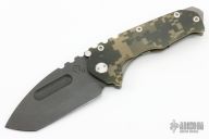 The Praetorian G, by Medford Knife and tool, features a bead blasted, anodized finished titanium/camo G-10 frame and black blade. The clip point blade material is D2 steel. The knife has a titanium clip, tip up carry. Comes with original box and papers. Nice detent, lockup and blade seating. Has a couple light scuffs, otherwise excellent condition. Comes with original hard case.