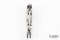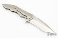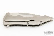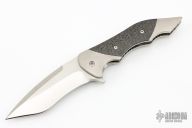 This framelock flipper by Frank Fischer features a satin finished recurve blade with false top edge, notched thumbrest and flipper. The handle has an orange peel finished frame with carbon fiber inlay and tip down titanium clip. Nice detent, lockup and blade seating. Excellent condition. Comes with a zippered case.