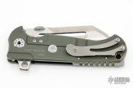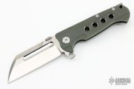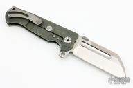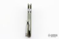 This ADV Butcher framelock flipper has a satin finished blade with swedge, fullers, notched thumbrest and flipper. Handle has an anodized and bead blasted titanium frame, tumble finished titanium back spacer and tip up clip. Nice smooth action, detent, lockup and blade seating. Comes with zippered case. Has a few scuffs, otherwise excellent condition.