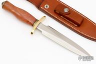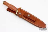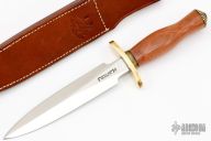 The Model 2-7 by Randall Made Knives is a heavily made dagger or dirk. This knife has an 7" stainless steel blade, .221" blade stock and 1.282" blade depth, hidden tang construction. The handle has a brass forward curved guard and scalloped brass butt, and a pink ivory wood handle with black spacers. Comes with a brown leather sheath marked 2-7c. Excellent condition.