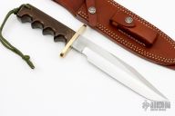 This Model 14 by Randall Made Knives features a satin finished blade with sharpened top edge, .198" blade stock. 1.385" blade depth, full tang construction. The handle has a brass guard, brown linen micarta handle with a lanyard hole at the butt. This knife was designed to meet the demand for an almost indestructible all-purpose knife, though it is especially suited for combat and survival purposes. Comes with brown leather sheath. Excellent condition.