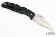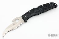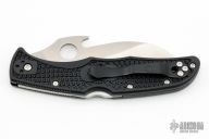 This Matriarch from Spyderco features a satin finished full serrated hawkbill blade with thumbhole and wave features. The handle is black plastic with a black stainless steel tip up clip. Comes with original box. Excellent condition.