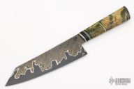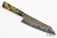 This 8" Patterned GoMai Gyuto by Rob Wayman features a 1084 High Carbon Steel Core with Nickel and 160 layer Random Pattern Damascus (1084 and 15n20) clad blade, .100" blade stock and 2.133" blade depth, hidden tang construction. The handle has a hammered stainless steel collar, stainless steel butt cap, stabilized Birch Burl grip with toxic green G-10, black G-10 and nickel silver spacers. Comes with a zippered case can COA. New from maker. Beautiful knife with amazing fit and finish.