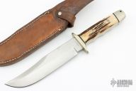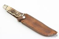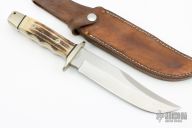 This bowie from A.G. Russell features a satin finished blade with a false top edge, .215" blade stock and 1.531" blade depth, full tang construction. The handle has nickel silver guard and butt, and stag scales with black spacers. Comes with original brown leather sheath with belt loop. Has some scratches, otherwise good condition. Dated 1999