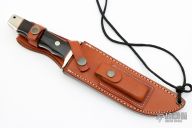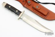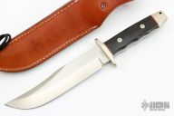 This bowie from A.G. Russell features a satin finished blade with a false top edge, .215" blade stock and 1.531" blade depth, full tang construction. The handle has nickel silver guard and butt, and black wood scales with red spacers. Comes with original brown leather sheath with belt loop. Has some scratches, otherwise good condition. Dated 2002