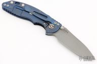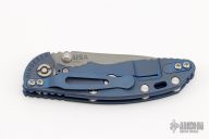 This 3" XM-18 Slicer by Rick Hinderer Knives features a working finished drop point blade with swedge, dual thumb studs and notched thumbrest. The handle has a textured black  G10 scale over battle blue titanium liner and frame with matching filler tab and pocket clip. Includes original box, papers and extra hardware. New condition.