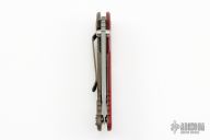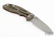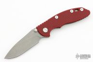 This 3" XM-18 Slicer by Rick Hinderer Knives features a working finished drop point blade with swedge, dual thumb studs and notched thumbrest. The handle has a textured red   G10 scale over battle bronze titanium liner and frame with matching filler tab and pocket clip. Includes original box, papers and extra hardware. New condition.