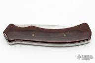 This left-handed Sidewinder II scale-release auto features a satin finished blade with nail nick. The handle has maroon line micarta scales, anodized titanium, stainless steel backspacer. #39. Nice action, lockup and blade seating. Has a couple light scratches, otherwise excellent condition.