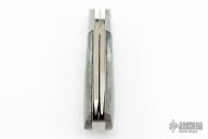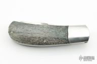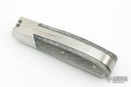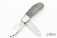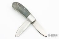 This knife by Jeff Cover features two hand rub satin finished blades with nail nicks.  The handle features dovetail stainless steel bolsters, giraffe bone covers with black liners, stainless steel liners and springs. Has half-stops.  Has some scratches, otherwise good condition.