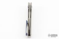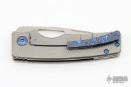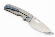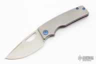 This knife by the OZ Machine Company features a matte finished Z-FiNiT blade with a false top edge, thumbhole and notched thumb rest.  The handle features a gold putter milled titanium frame with a zircuti tip up pocket clip and titanium backspacer.  Includes box and COA dated 12-31-21. New condition.