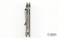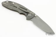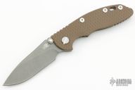 This 3" XM-18 Slicer by Rick Hinderer Knives features a working finished drop point blade with swedge, dual thumb studs and notched thumb rest. The handle is comprised of a textured FDE G10 scale over titanium liner on the "A" side and a working finished titanium lockside and titanium barrel spacers with matching filler tab, pocket clip, lockbar stabilizer and pivot. New condition.
