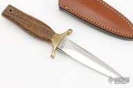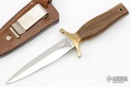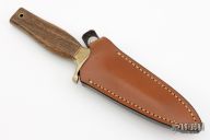 This Mark I Presentation Boot Dagger by Gerber features a mirror polished double edged blade, .250" blade stock and .959" blade depth, hidden tang construction. The handle has a brass guard, and wood handle with red and white spacers. Comes with original brown leather sheath. #003977 blade. Has a few light scratches, otherwise excellent condition.