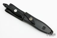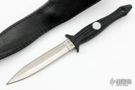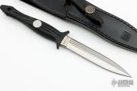 This Shadow I from Al Mar Knives features a doubled edge dagger style satin finished blade, .149" blade stock and .747" blade depth. The handle is comprised of zytel over hidden tang construction with lanyard hole in pommel. Comes with black leather sheath. Excellent condition.