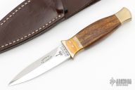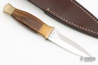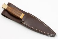 The Guardian began its manufacture in 1981 and was designed by R.W. Loveless. This knife was originally designed for Enforcement and Military Operations. It has a mirror finished double edged blade, hardwood grip with brass bolster and butt. The particular piece comes with the original leather sheath. Wonderful condition for its age; never used. Excellent condition. Brass is showing a little patina. Number 001390