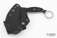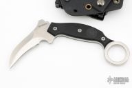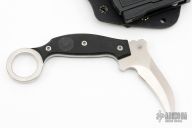 This Model 10 karambit features a satin finish blade with a false top edge and notched thumbrest, 3/16" blade stock and 3/4" blade depth, full tang construction. The handle has black G10 scales, 1" ring diameter. Great fit and feel in the hand. Comes with a kydex sheath with TekLok. Excellent condition.