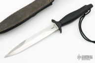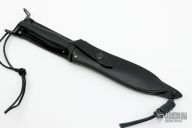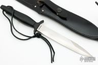 From the excellent resource of militarycarryknives.com: "The Command II knife is very similar to the Mark II. It has the same handle and the blade is the same length. However the Command II blade differs in several ways. First, the blade is not double-edged. Only the bottom edge and 3 inches at the front of the top edge are sharpened. Second, there are serrations (teeth) only on 2 of the 3 inches of the sharpened top edge. I've only noted one Command II blade without serrations. I don't know much about these knives. They were possibly designed for locations where a double-edged knife was illegal. They are serialized in the same manner as the Mark II. They can be found with tool steel blades and 6-digit numeric serial numbers (e.g. 007203) as well as stainless steel blades with an alpha-numeric serial number (e.g. A7420S). They were issued in two versions, the first with a satin finish blade and the second with a black blade. There were no camouflage versions of this knife. For the satin finish blade knives, the highest tool steel bladed serial number I've noted is 015197. The highest stainless steel bladed serial number I've noted is A9444S. The black blade models were only offered in stainless steel. The black bladed serial number range I've noted is between A3512S and A8019S. These serial number ranges imply that less than 22,700 of the Command II knives were produced. The Command II was probably produced only between late 1979 and 1982. I suspect that there wasn't a big demand for these knives and so they were discontinued. " This one is in excellent condition with the original black leather sheath. Serial 013038.
