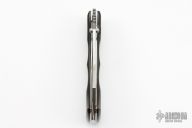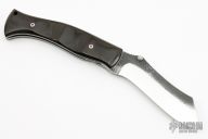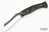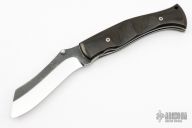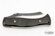 This linerlock folder by Citadel Knives features a mirror polished blade with forge finished flats, notched thumbrest and dual thumbstuds. The handle has black linen micarta scales, polished stainless steel liners and backspacer with lanyard hole. Comes with zippered case. Excellent condition.