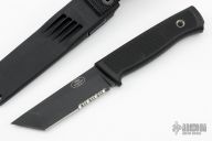 The Fallkniven PRK Police and Rescue Knife is the result of years of development work and experience. The PRK is an extremely strong and reliable tanto knife for use in any situation. The laminated CoS cobalt specialty steel blade has a black Ceracoat finish and a partially serrated edge. The Thermorun handle is textured and has a protruding tang at the base. This PRK knife comes with a Zytel sheath. Comes with original box. Excellent condition.