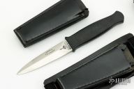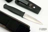 This Gerber Guardian is an R.W. Loveless design and features a satin finish dagger style blade. Black aluminum textured handle with "Guardian" stamped on side. Knife includes a black leather sheath and harness assembly with extra sheath. Complete with original boxes and paperwork. #011400 on the blade.