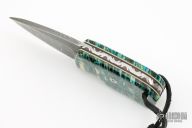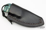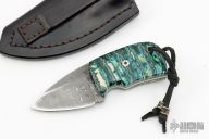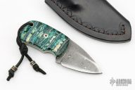 This knife features a Damascus blade with .146" blade stock and 1.489" blade depth, full tang construction. The handle has mammoth tooth scales with black/white liners and mosaic pins. Coems with a black leather sheath. Has a few light scuffs, otherwise excellent condition.