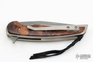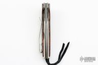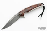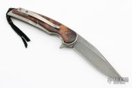 This Model 11 liner lock flipper features a Damascus blade with flipper. The handle has rosewood burl scales, orange peel finished titanium liners, backspacer, and tip up clip. Includes IKBS (Ikoma-Korth Bearing System) for smooth and fast flipper opening that requires no wrist action. Nice blade seating, detent and lockup. Has a few light scratches, otherwise excellent.