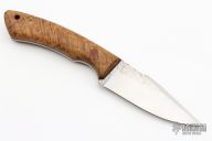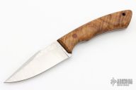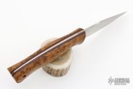 The Mamushi by Osprey Knife and Tool features a satin finished harpoon clip point blade with hammer marked flats, full tapered tang construction, .101" Blade Stock 1.191" Blade Depth. The handle has ash burl wood scales with black G-10 and brown canvas micarta liners. Excellent Condition.