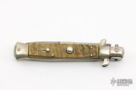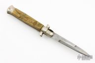 This vintage picklock automatic by Mauro Mario features a bayonet ground blade with false top edge. The handle has nickel silver bolsters, sheep horn scales, D-stamped brass liners, steel backspacer. Has safety. Nice action. Has scratches and patina, otherwise good condition for its age.