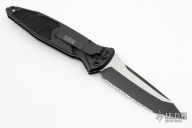 This Socom Elite Auto has a two-tone tanto fully serrated blade with notched thumbrest. Black aluminum handle with non-slip inserts. Stainless steel clip, tip down carry. Glass breaker. Dated 12/2022 and s/n 8027. Comes with original box and papers. Excellent condition.