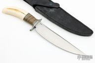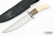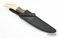 This Fighter by Master Smith P.J. Tomes features a satin finished blade with false top edge, .149" blade stock, 1.394" blade depth, hidden tang construction. The handle has a Damascus guard, warthog tusk grip with black/nickel silver/wood spacers. Comes with a black leather sheath. Has a couple spots on the Damascus guard, otherwise excellent condition.